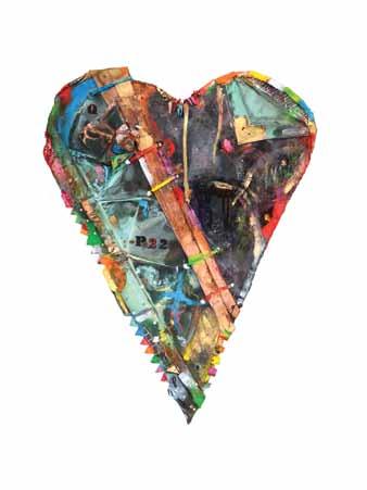Dans son atelier, l’homme récupère même ce qui tombe au sol. Au printemps 2010, il lançait l’exposition Le pied au plancher. « Actuellement, je reprends cette série-là; je lui donne un nouveau souffle en y incorporant du cuivre que je tords, grave, troue et repeins. J’en fais également le matériau de base de ma dernière série, Au cœur de nos vies… parce que le cœur est omniprésent dans nos existences », ajoute-t-il.