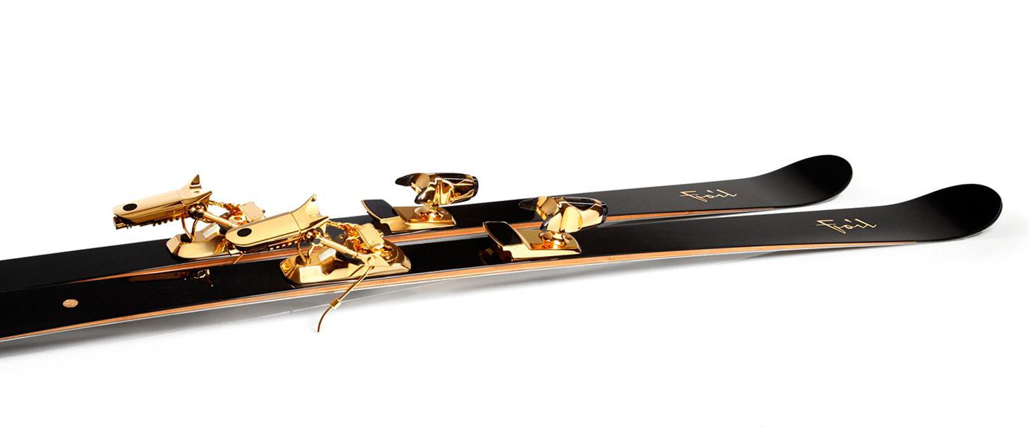 Ces skis, qu’on pourrait qualifier d’œuvres d’art, sont fabri qués avec du chêne des marais âgé de plus de 8 000 ans.Les fixations et bâtons dorés plaqués en or 14 carats attirent tous les regards.