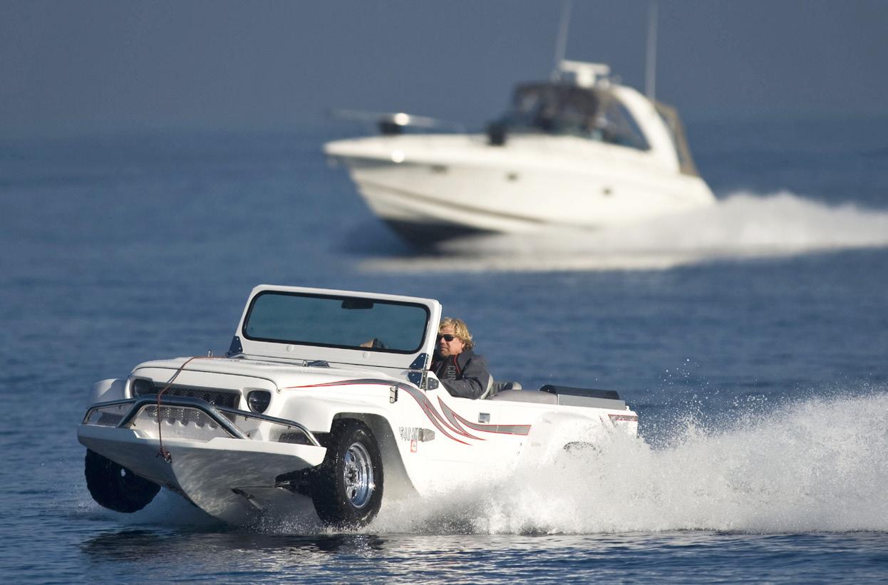 Votre camping favori affiche complet ? Suffit alors d’aller sur le lac le plus proche avec votre Terra Wind ! Cette imposante autocaravane de 42,5 pieds à double rallonge coulissante construite en Caroline du Sud pèse 15,5 tonnes. Elle a un turbodiesel Caterpillar de 7,2 litres et 330 chevaux et, pour la stabiliser dans l’eau, deux flotteurs sont fixés à ses flancs. L’intérieur vaste et luxueux émule celui des yachts de prestige avec de riches boiseries, des comptoirs de granite et des planchers en marbre.
