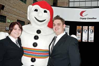Bonhomme Carnaval en compagnie de deux étudiants en techniques de gestion hôtelière du cégep Limoilou.