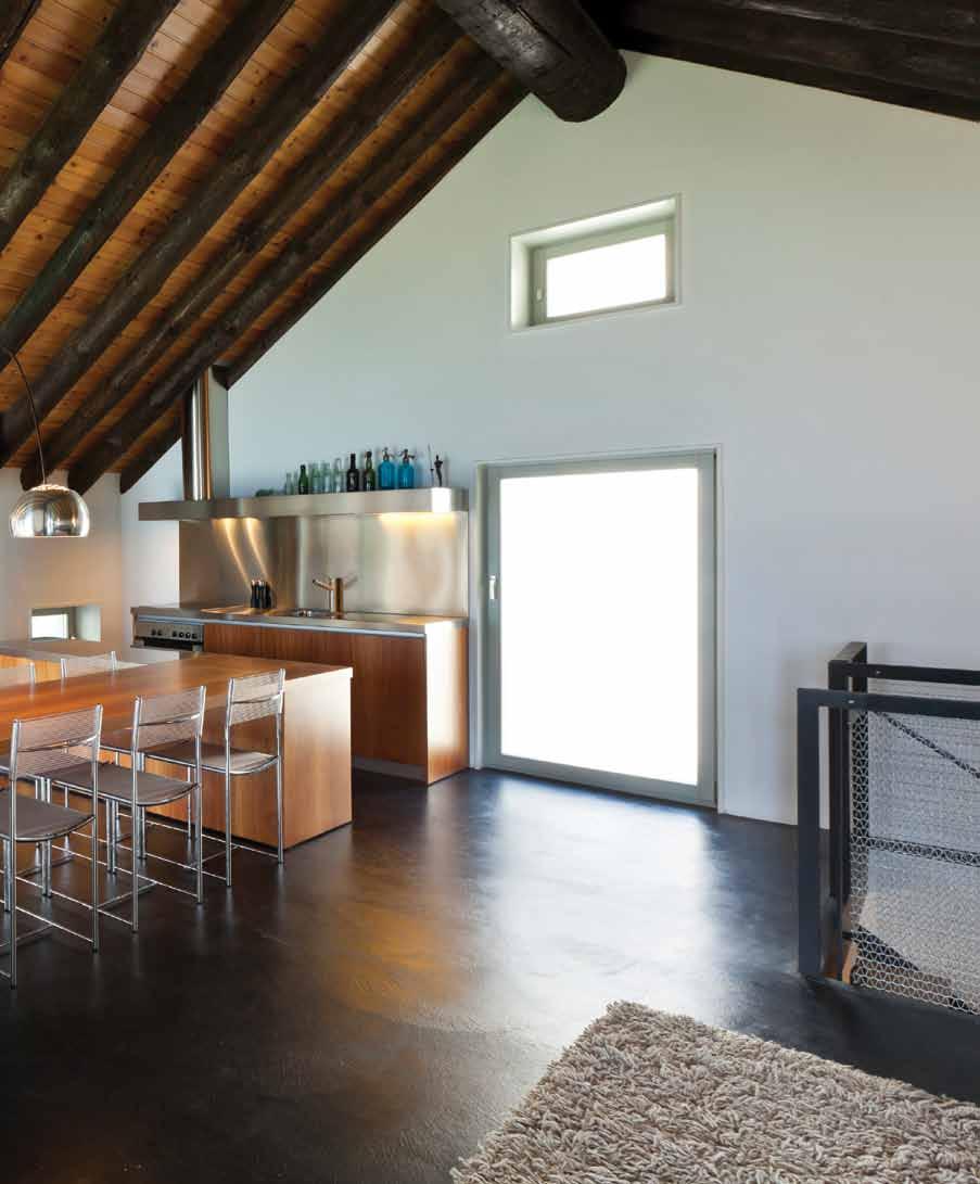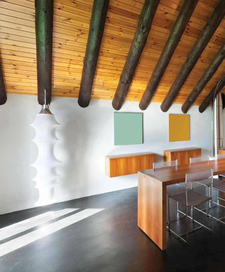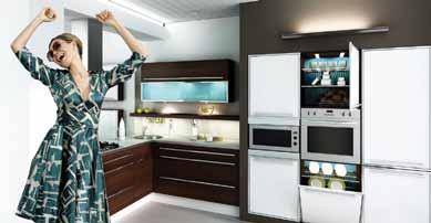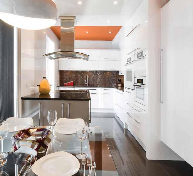 Dans cette cuisine entièrement constituée de laque italienne blanche, j’ai opté pour un plafond et un dosseret de couleur orangée, ce qui donne de l’éclat et du caractère à la pièce.