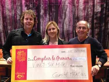 Le 4e « Meating de la relève », qui a eu lieu voilà quelques mois au Cosmos de Lévis, a permis d’amasser 26 000 $ au profit du Comptoir Le Grenier, un organisme qui vient en aide à 3 500 personnes démunies par semaine depuis 1991, grâce à l’implication de 75 bénévoles. Le « Meating de la relève » sert également à soutenir la relève des jeunes gens d’affaires des deux rives de Québec.