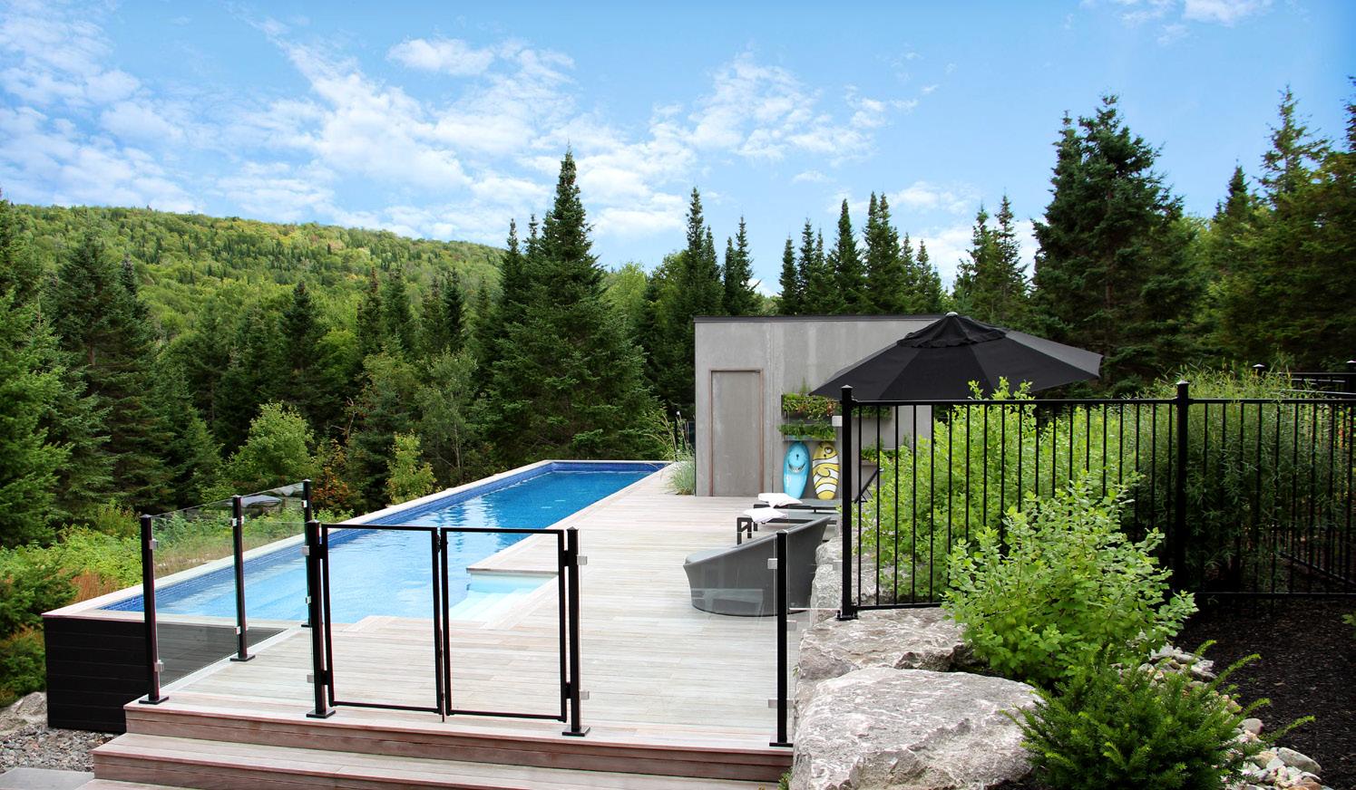 Conçu par l’architecte de la maison pour assurer une continuité dans le design, le pavillon en revêtement de béton léger se marie à merveille avec la terrasse de bois d’ipé.