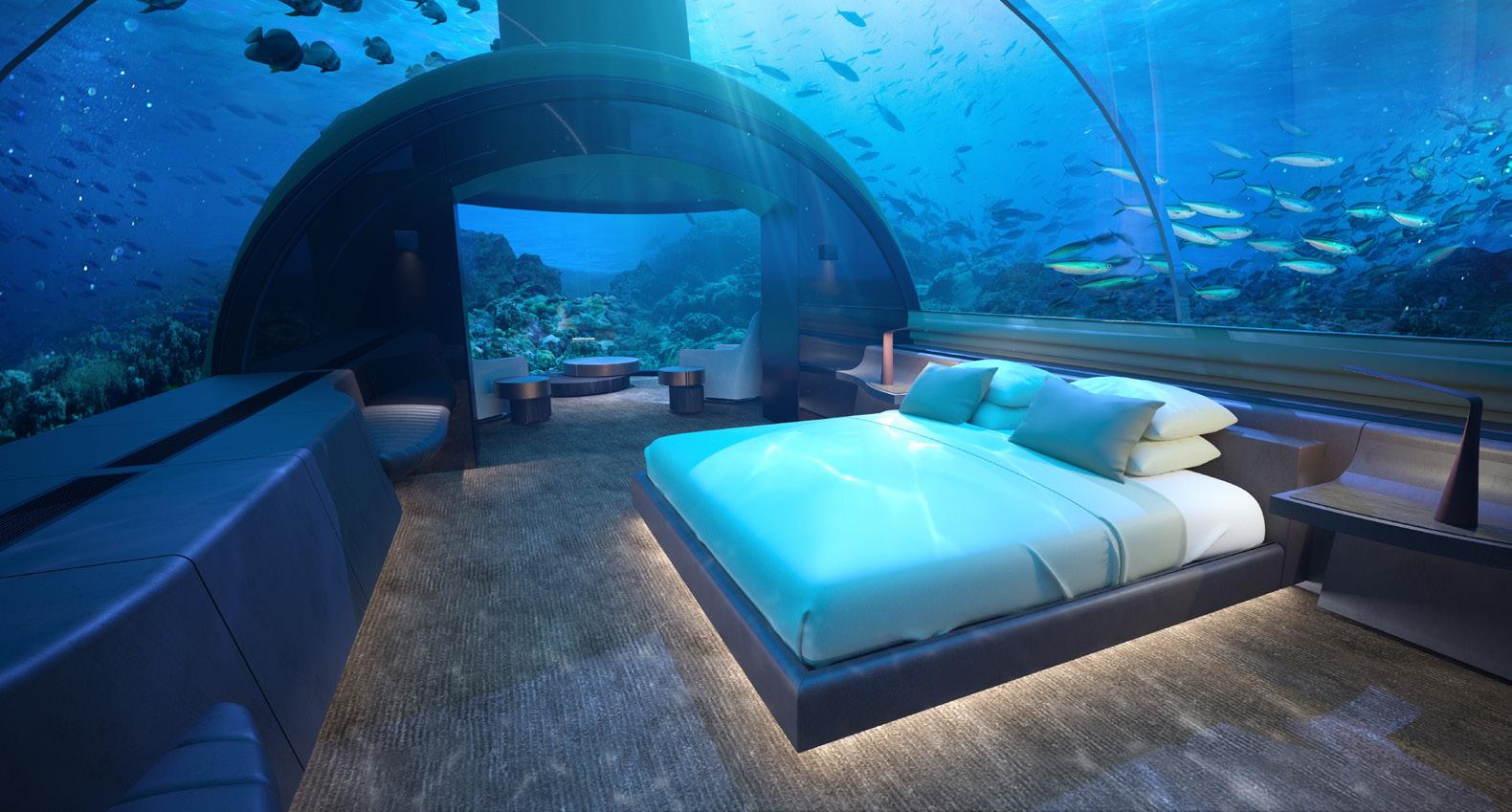 Outre le ballet marin constant qui émerveillera à toutes heures, que comprendra cette suite à 50 000 $ la nuit, aménagée sur deux étages ? Pour ceux qui voudront se garder la tête bien audessus de l’eau, l’étage à la surface disposera de deux chambres avec salle de bains, alors que la suite sous l’eau sera dotée d’un grand salon et d’une baignoire à remous. Les occupants disposeront aussi d’une cuisine avec salle à manger, un bar, une terrasse, une piscine, un gym et même des appartements séparés pour, bien sûr, le personnel.
