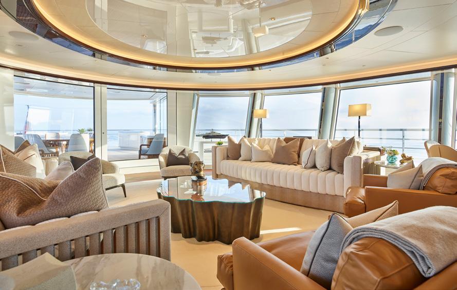Le yacht comprend d’énormes zones de verre miroir et incurvé du sol au plafond.