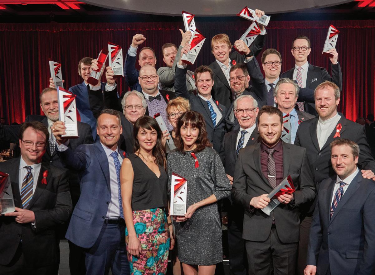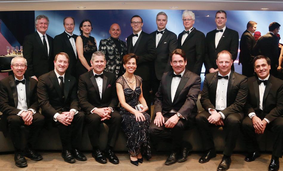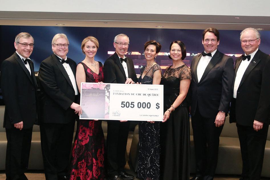 Gaston Bédard, président du C.A., CHU de Québec-Université Laval; Dr Gaétan Barrette, ministre de la Santé et des Services sociaux; MarieClaude Paré, présidente et chef de la direction, Fondation du CHU de Québec; les coprésidents d’honneur du Bal, Yvon Charest, président et chef de la direction, et Renée Laflamme, vice-présidente exécutive, Solutions d’assurance et d’épargne collectives, iA Groupe financier; Gertrude Bourdon, PDG, CHU de Québec-Université Laval; Pierre Karl Péladeau, président et chef de la direction de Québecor, présentateur de l’activité; et Ross Gaudreault, président du C.A., Fondation du CHU de Québec.
