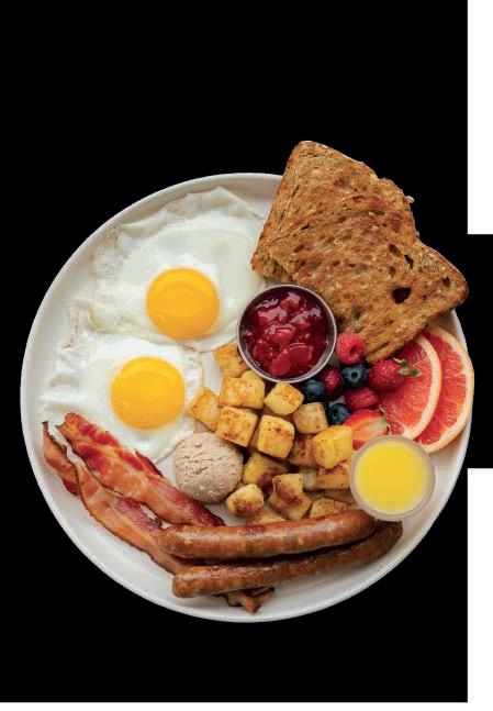 INCLUANT : 1 œuf avec viande (au choix : saucisse, bacon ou jambon), patates et fruits, café à volonté +TX