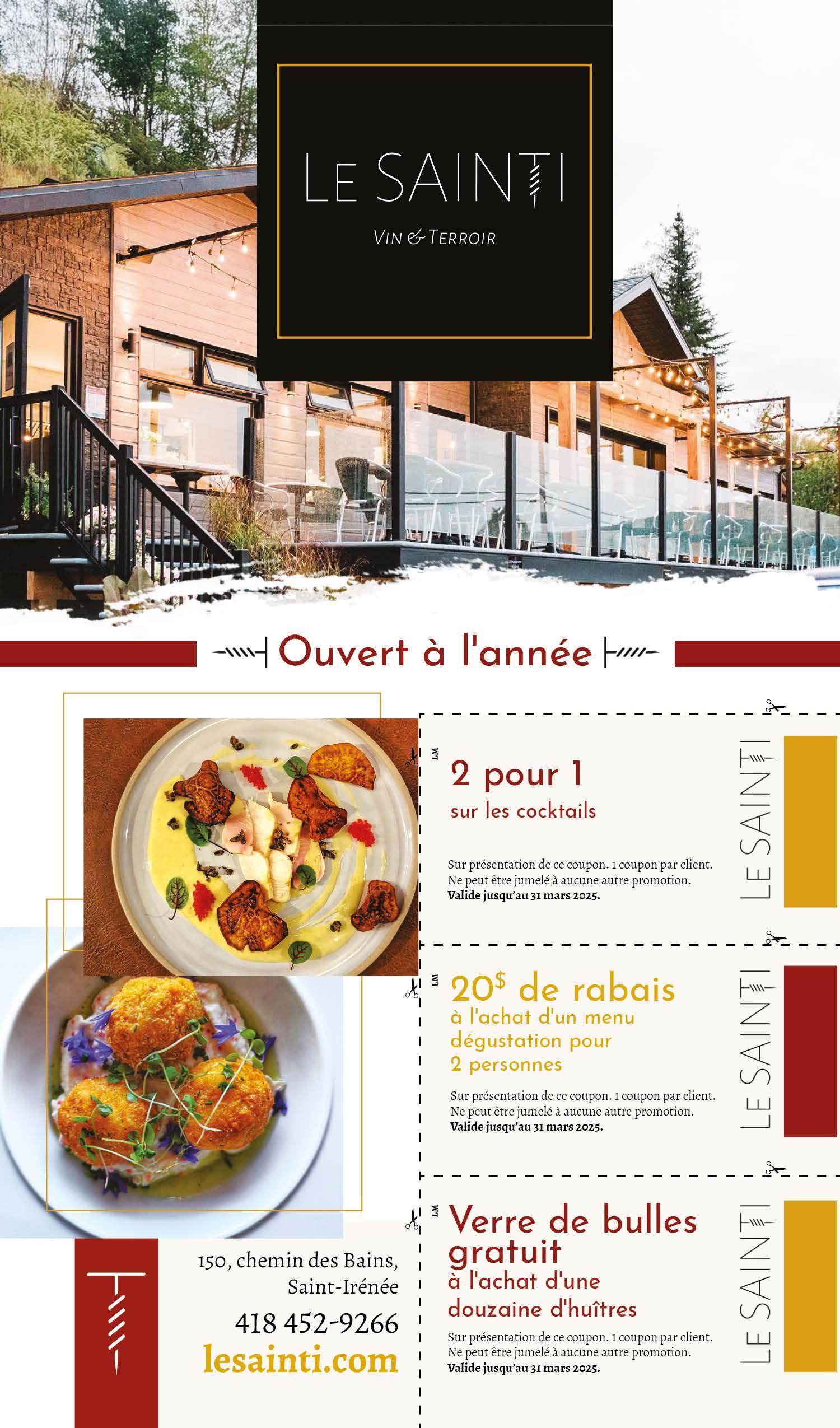 Sur présentation de ce coupon. 1 coupon par client. Valide sur 2 repas par facture. Ne peut être jumelé à aucune autre promotion.