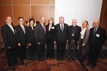 Roger Leduc, v.-p. du Déjeuner, Cabinet de services financiers Roger Leduc; Jean-Simon Deschênes, avocat, Lavery, et président, Fonds des Jeunes philanthropes de Québec; Joliette Trân, Fondation Trân Fusion; Fernand Paradis, conférencier en vedette; Lise Saint-Martin, présidente du Déjeuner, Groupe-conseil Tremblay; John MacKay, président d’honneur du Déjeuner, et PDG, Société d’habitation du Québec; Mgr Gaétan Proulx; Nataly Rae, directrice générale, Fondation communautaire du grand Québec; et l'Abbé Marc-Verchères Poiré, membre fondateur du Déjeuner.