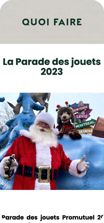 Laissez-vous charmer par la magie des Fêtes au Sanctuaire Notre-Dame-du-Cap en vous baladant parmi les exposants et les spectacles et en admirant les jardins enneigés illuminés. Let yourself be enchanted by the magic of the holidays at the Sanctuary of NotreDame-du-Cap as you stroll among the exhibitors, watch the shows and admire the illuminated, snowcovered gardens.