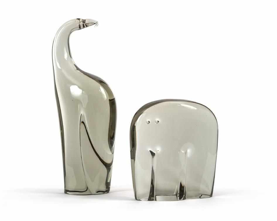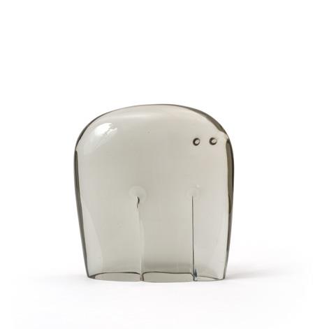 Una figura di elefante in vetro talpa trasparente massiccio. Monogramma inciso "LS". Altezza cm. 16.
