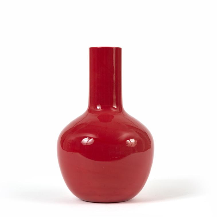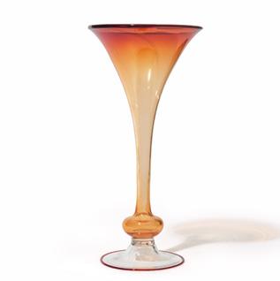 Dieci calici a flute in cristallo decorati a fasce, anelli e spirali in rosso. Altezza cm. 22.5.