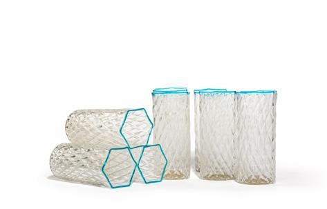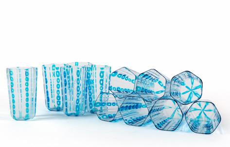 Dodici bicchieri esagonali in cristallo con decoro di murrine azzurre sugli spigoli, opacità.