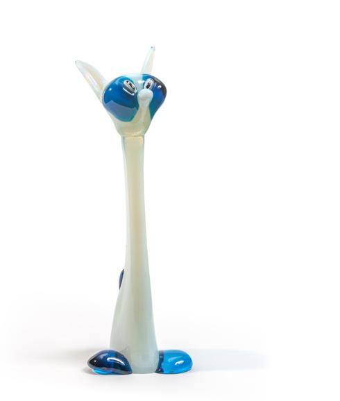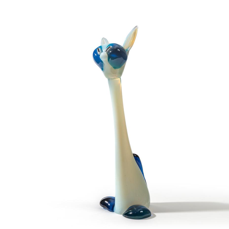 Una figura di gatto in vetro opalino azzurro e particolari in vetro blu. Altezza cm. 58.5.