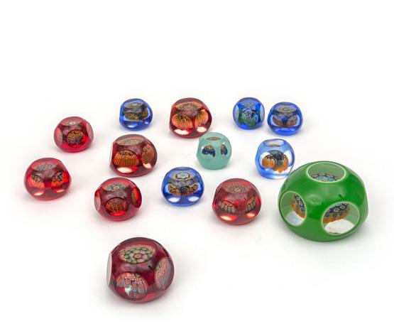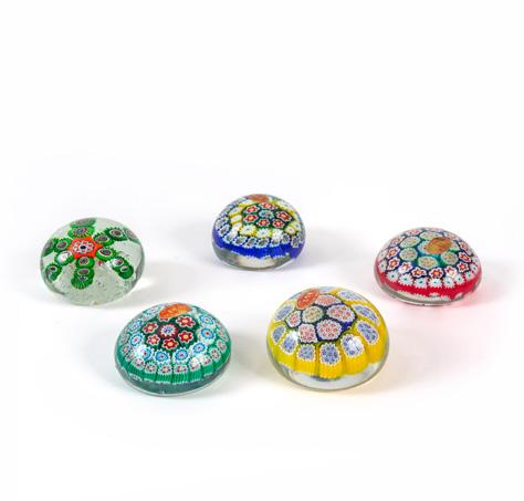 Cinque fermacarte a murrine. Etichette originali. Diametro cm. 8.