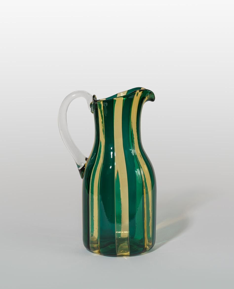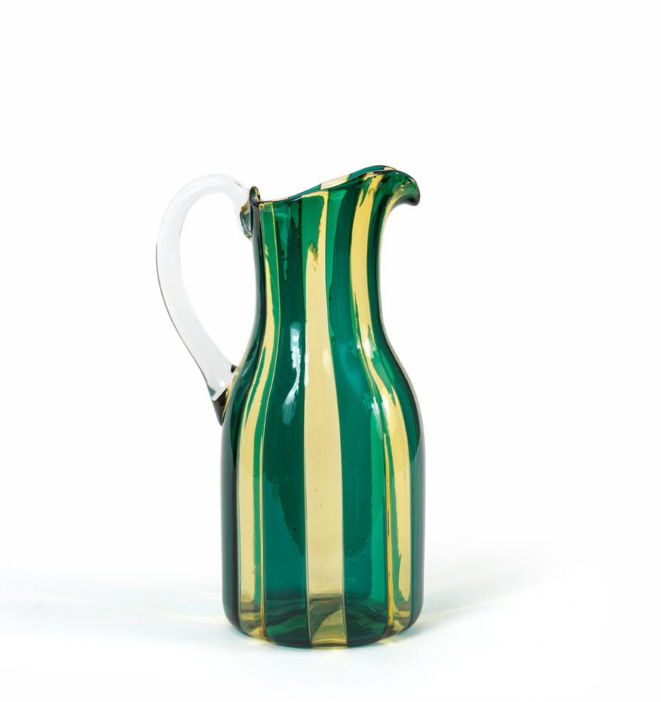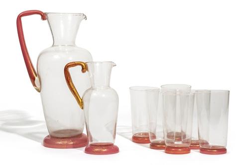 Il servizio è in vetro trasparente bluino. Firma ad acido su una brocca 'MVM Cappellin Murano'.
