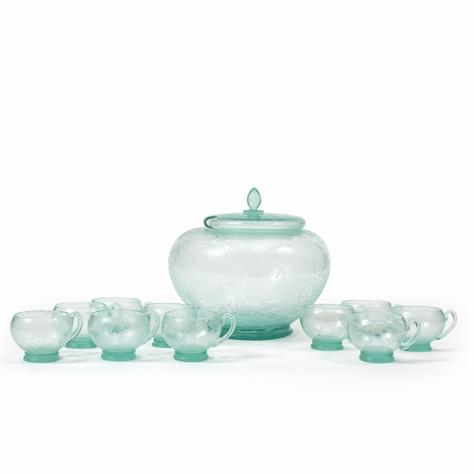 Una coppa con coperchio e dieci coppette con manico. Vetro corroso verdino. Altezza coppa cm. 24, altezza coppette cm. 6.