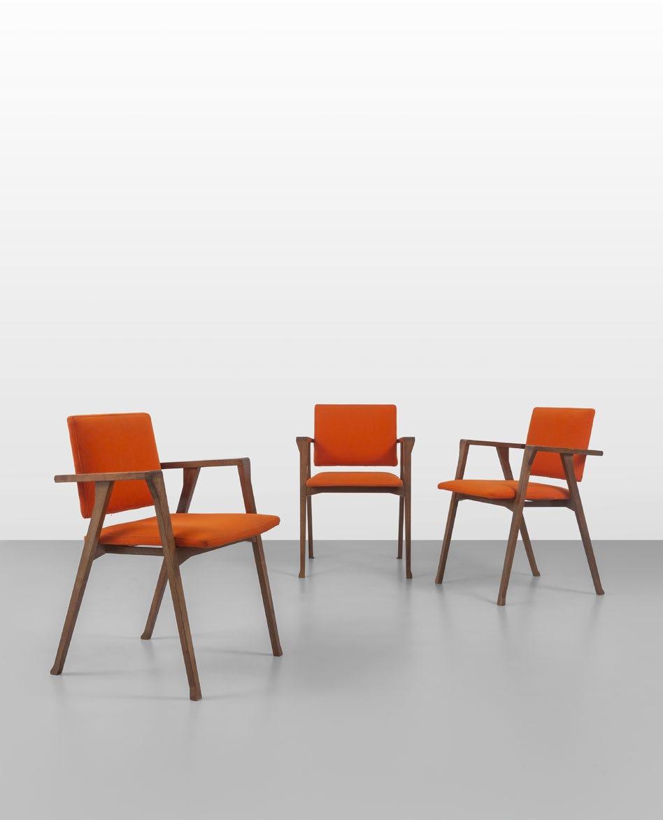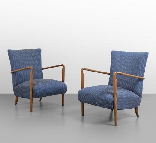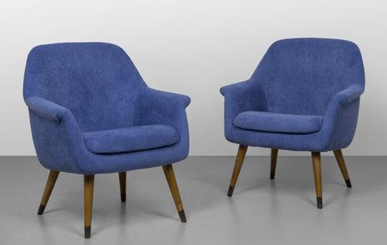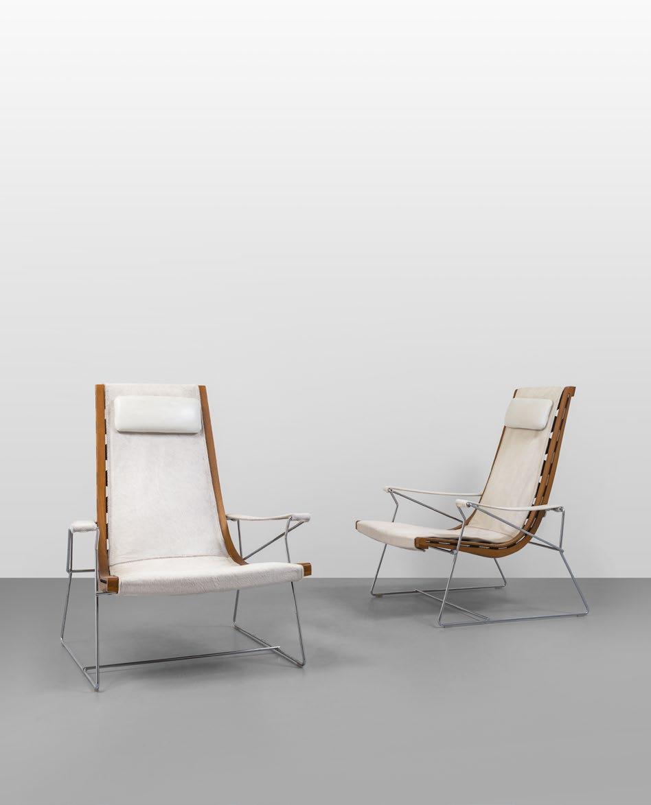 A pair of 'J.J.' armchairs, 2012. Chrome-plated steel rod, oak wood, lamb fur and leather. 37.7in. high, 29.1in. wide, 34.2in. deep.
