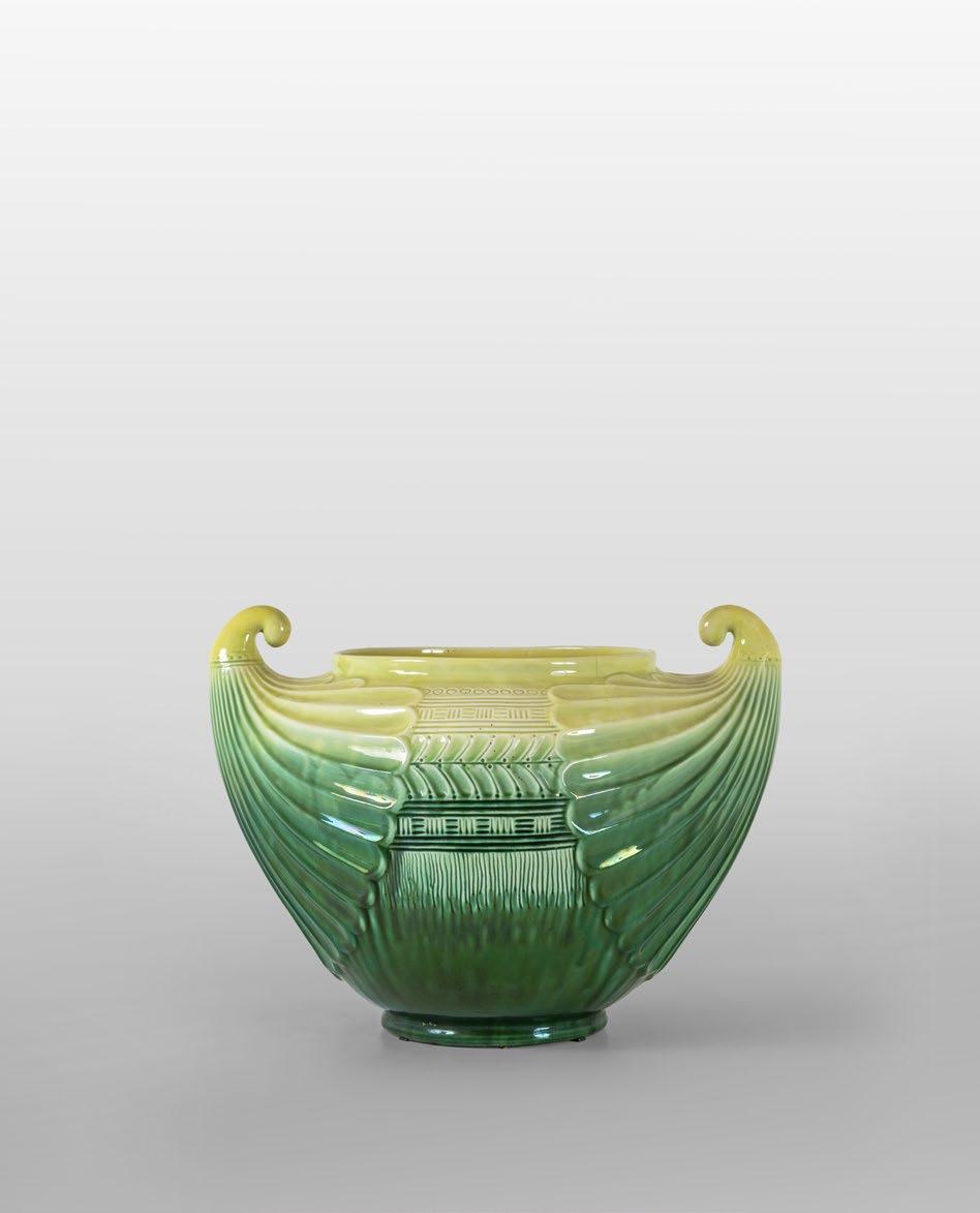 Un grande cache-pot in ceramica per S.C.I. (Società Ceramica Italiana, Laveno), circa 1910. Terraglia forte, formatura a stampo, smalto lucido. Altezza cm 43, larghezza cm 57.