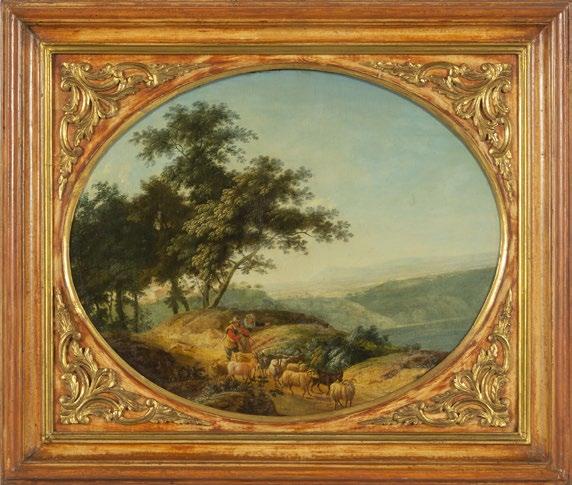 Scuola piemontese sec.XVIII “Paesaggi animati con armenti e personaggi” coppia di olii su carta, cornici in legno coeve laccate rosse e oro cm. 80x64