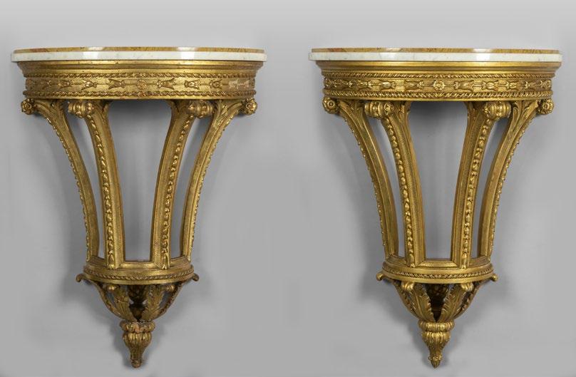 Coppia di consoles in legno intagliato e dorato a mecca, pianetti in marmo, Roma sec.XVIII cm. 64x35 h. 42