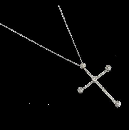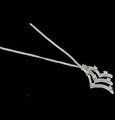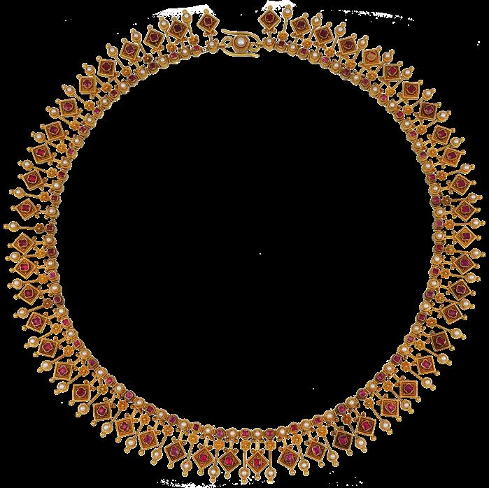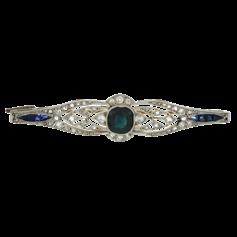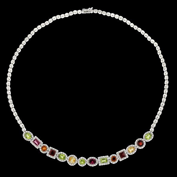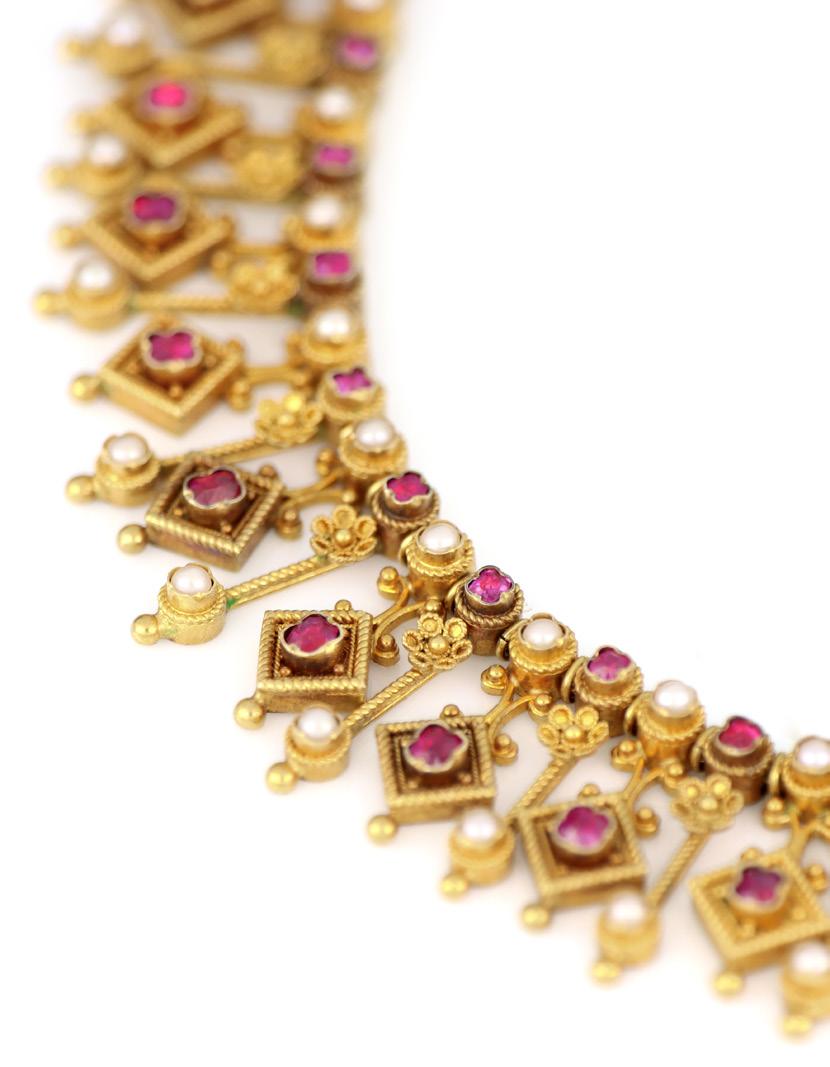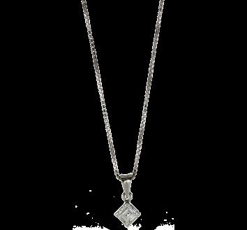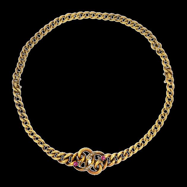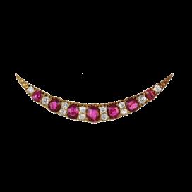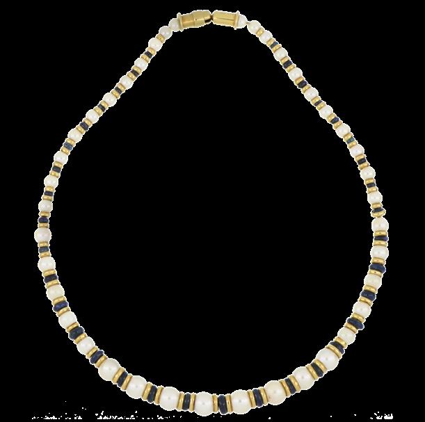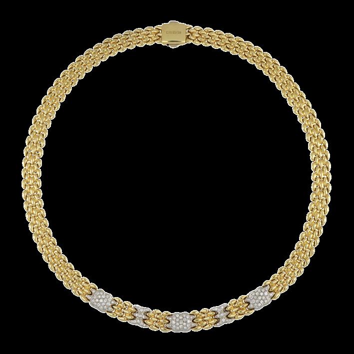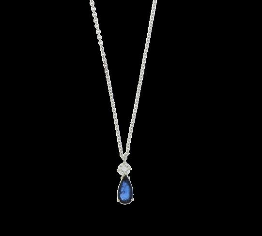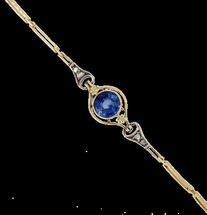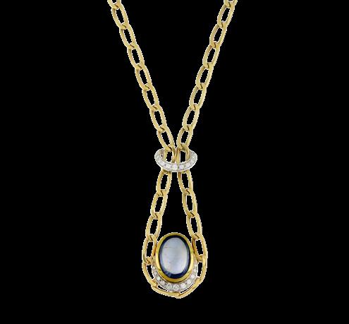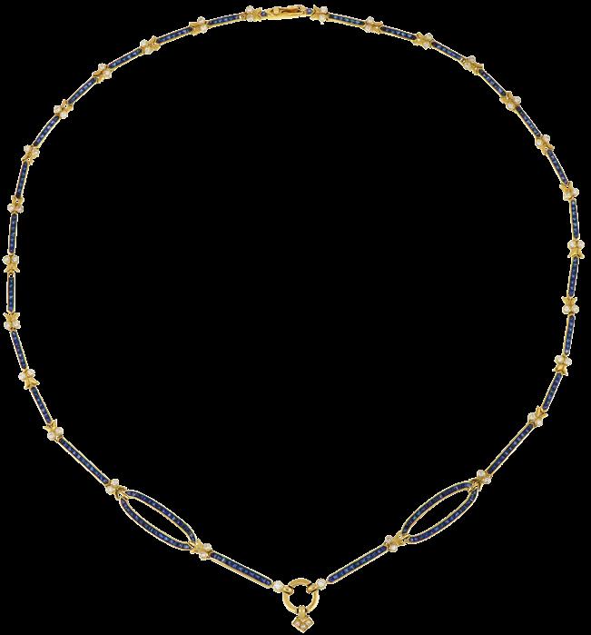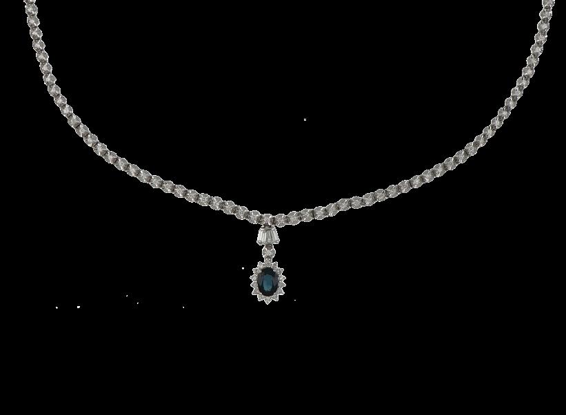 Collana in oro giallo e bianco, a “Bricchetti”, con al centro zaffiro rotondo sintetico, e piccoli diamanti taglio rosa.