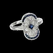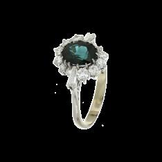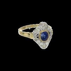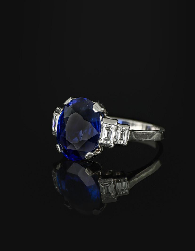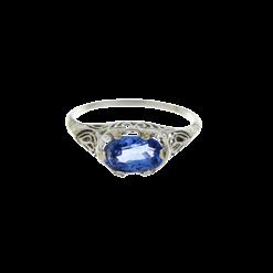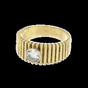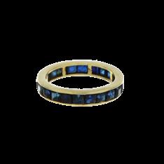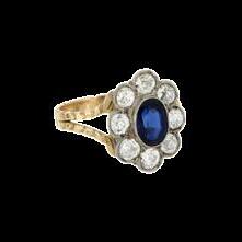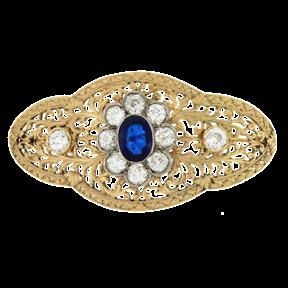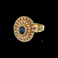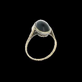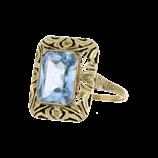 Anello di foggia antica, in oro giallo inciso a fogliette e roselline, al centro pietra azzurra di sintesi con graffi. Misura n. 22.