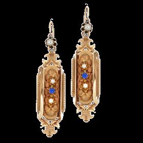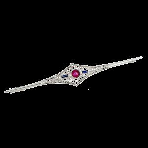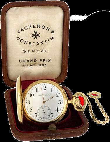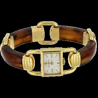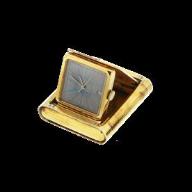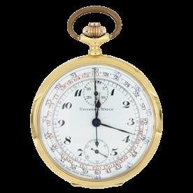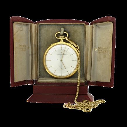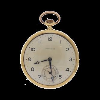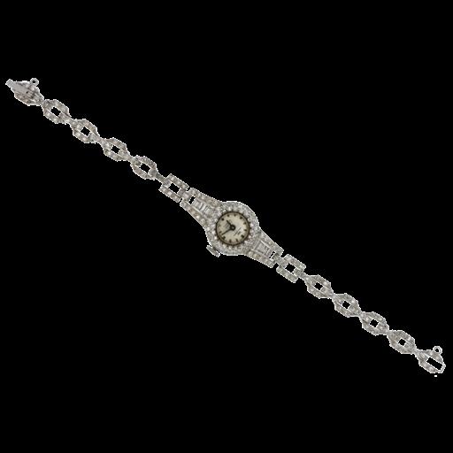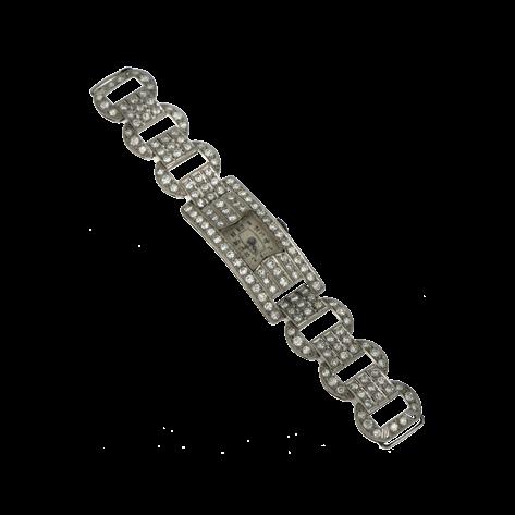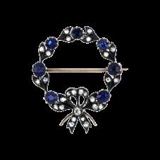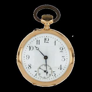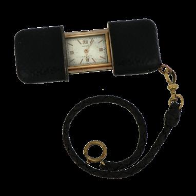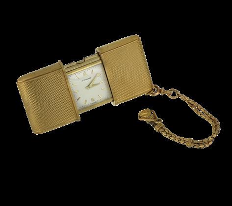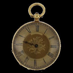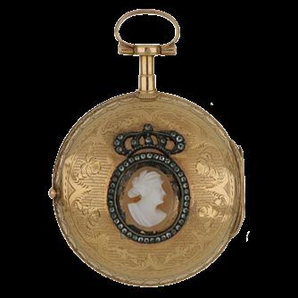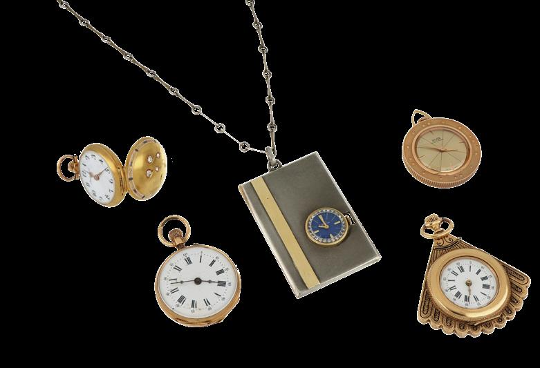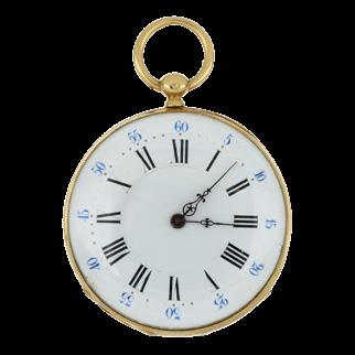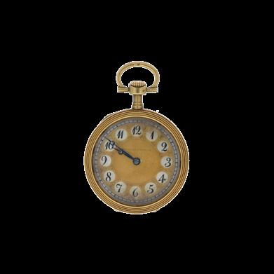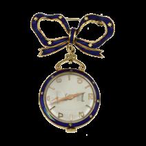 Gold short ribbon pocket watch with diamonds and a small sapphire.