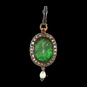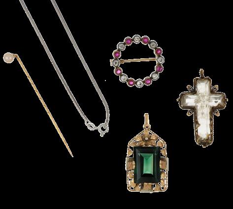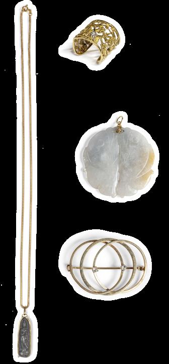 Lotto composto da un ciondolo in giadeite con briglia in oro giallo, una spilla a tre cerchi in oro a 9kt (4,40 gr) Anello a fascia con lavorazione battuta tipo Sforza e diamanti di circa 0,09 ct Catena in oro con ciondolo in pietra lavica.