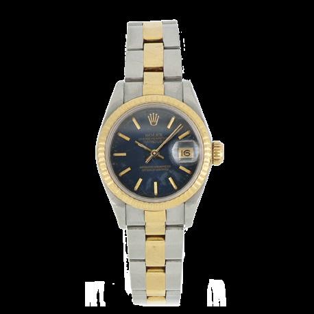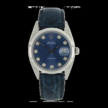 Rolex, orologio da uomo modello Precision Oysterdate, quadrante blu soleil con diamanti agli indici, probabilmente after-market, datario ad ore 3, vetro plastica, mancante della sfera dei secondi al centro. Diametro 34 mm, mancante di cinturino in acciaio ma con fibbia originale.