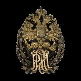 Stemma imperiale russo, in argento e oro con monogramma in oro rosa, punzoni del titolo alla maniera russa e testa di Minerva.