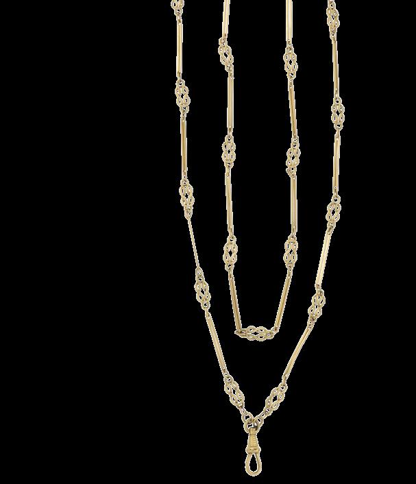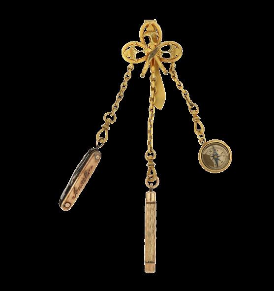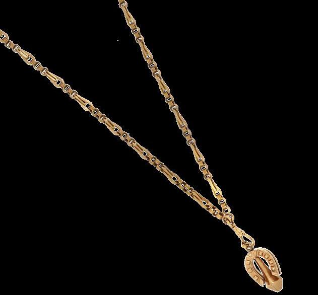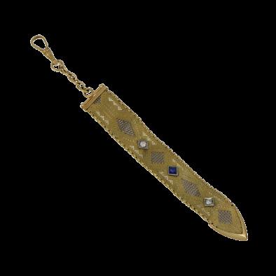 Particolare accessorio per orologio da tasca, in oro giallo e bianco a forma di cravattino impreziosito da due piccoli diamanti di taglio antico e uno zaffiro.