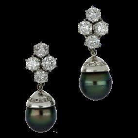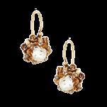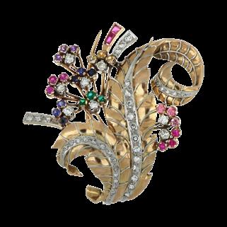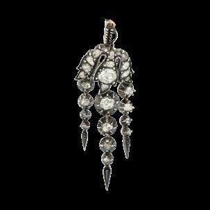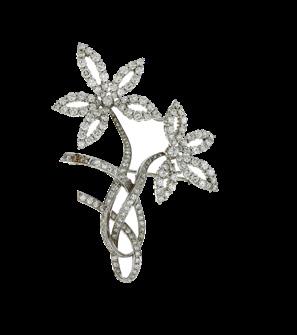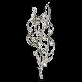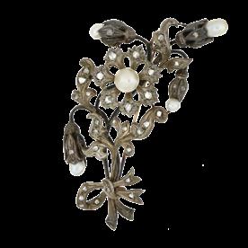 Spilla in argento ossidato e oro, a forma di tralcio di fiori con perle naturali e diamanti di taglio rosa.