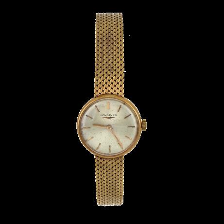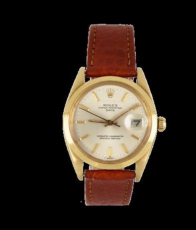 Rolex, orologio unisex in oro giallo modello Date, referenza 1500, lunetta liscia, quadrante argetè, indici a barretta, sfere a bastone, vetro plastica.