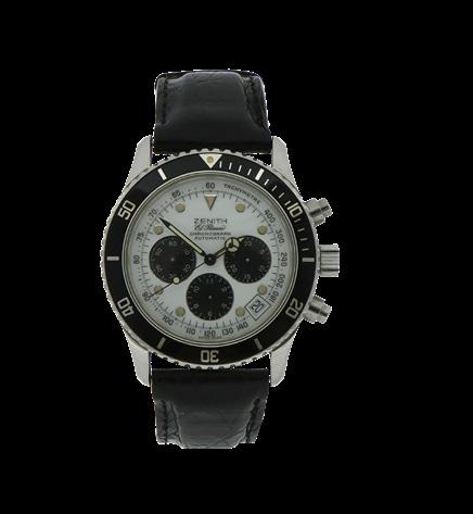 Zenith, storico orologio e cronografo da uomo, in acciaio, modello De Luca, animato da movimento meccanico a carica automatica “El Primero”, particolare datario a ore tra 4 e 5, lunetta girevole unidirezionale con tempi di immersione.
