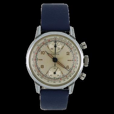 Thuya, orologio da uomo in acciaio con funzione cronografica, tasti a pompa e fondello a vite, quadrante argentato satinato con scala tachimetrica rossa alla periferia.