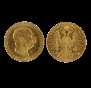 Moneta austriaca in oro giallo, 100 Corone, con raffigurato Francesco I, piccoli graffi.