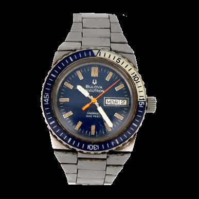 Bulova, orologio subacqueo da immersione,modello 666, in acciaio, movimento accutron funzionante, quadrante blu con indici luminescenti, bracciale originale, datario a ore 3 con giorno della settimana in italiano.
