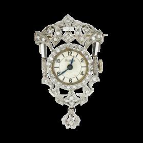 Gold short ribbon pocket watch with diamonds and a small sapphire.