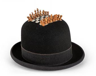 Hut Schachspiel (schwarz) 1990 mixed media on bowler hat h 6,69 in, ø 11,81x9,84 in signed inside the hat edition 1/5 inside the hat: label of Archive Caterina Gualco, Genoa