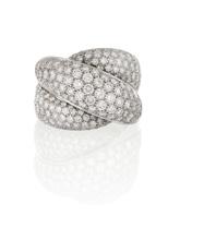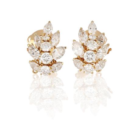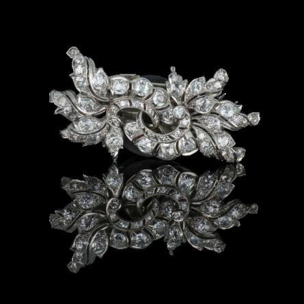 Fiocco a volute finemente aggiornate sul retro e montate su perni a vite, tempestata da 67 diamanti di taglio antico per stimati 18 ct circa, grande diamante di forma rotonda taglio antico di stimati 6,20 ct (12,12 x 12,23 x altezza non misurabile) Colore stimato K/L Purezza stimata VS1 fluo faint.