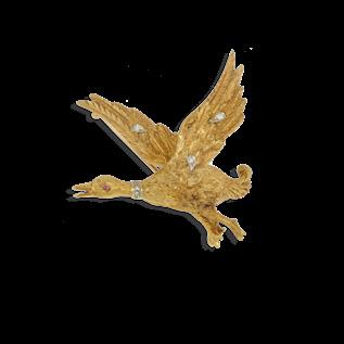 Delicata spilla di fine 800 a guisa di nuvola in oro rosso acidato con fine disegno rappresentante cupido, rondine e fiorellino.
