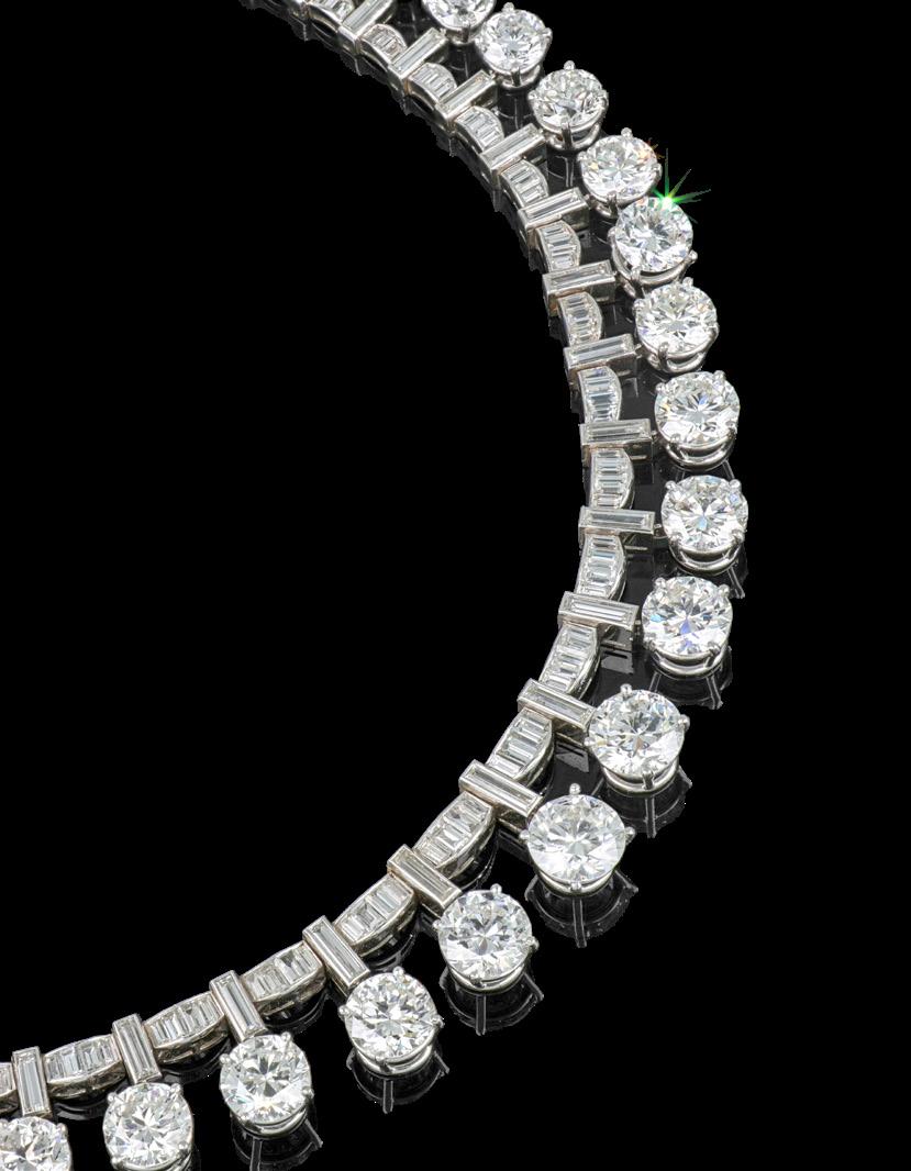 Importante ed elegante girocollo in oro bianco composto da 284 diamanti naturali accompagnato da report tecnico e gemmologico IGI di Milano n∞ 54180. Il collier si estende su volute di baguette con castoni pendenti su cui sono montati a griffe 56 diamanti di forma rotonda taglio a brillante, di cui 7 pietre sono comprese tra 1 e 1,5 ct, 8 pietre tra il 1,5 e 1,99 ct e 4 pietre oltre i 2 ct fino ad un massimo di 2,74 ct per la pietra più grande. Segue sul conditional report il dettaglio analitico.