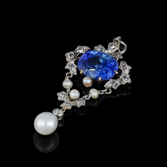 Pendente a goccia sormontata da un diamante di taglio antico di circa 1,80 ct (J/VS2) e importante e raro zaffiro naturale di forma a goccia di 5,18 ct accompagnato da report gemmologico svizzero SSEF attestante l’origine Kashmir e l’assenza di trattamento termico.