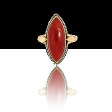 Anello a “Musone” in oro rosa e bianco, decorato con fini incisioni è impreziosito da un grande corallo ovale al centro.