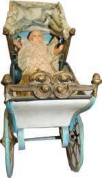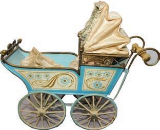 9 x 6.5 x 2.75” Antique German Tin miniature Carriage/Pram, Marklin / Maerklin 1890’s all original in beautiful condition, some silk breakage on sunshade w/ celluloid doll $1595.