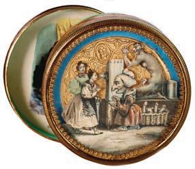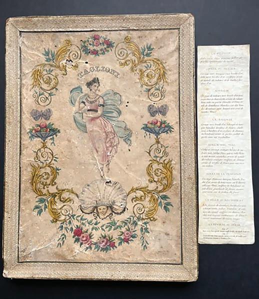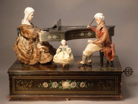 2. Music to the eyes and ears with this Continental automaton having two adult figures in 18th century style orig. clothing (some melting), heads molded in paper mache, and a small bisque child who dances to their accompaniment and direction, ca 1880. (12 3/4” wide, 10 1/4” tall) $3,850.