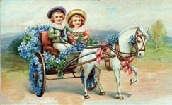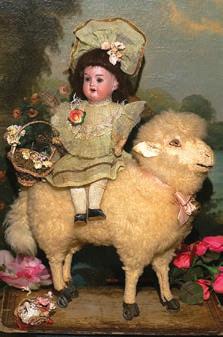 5) Antique Lambswool Pull Toy - luxury on wheels w orig. bisque head child riding in her Factory Ensemble 12”x10” $1800