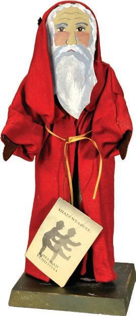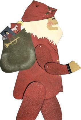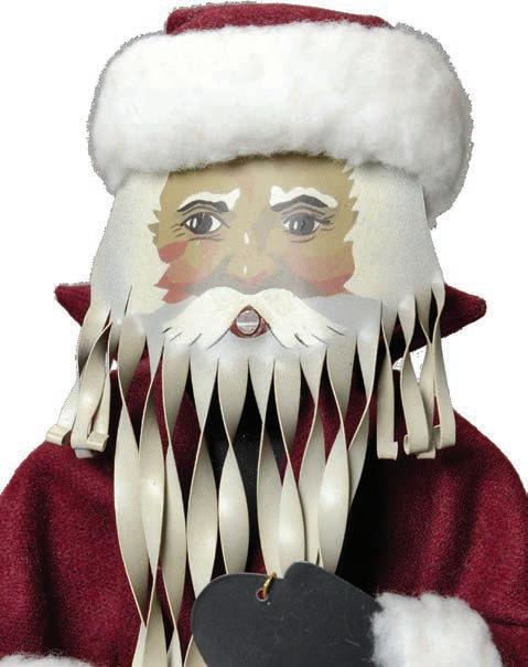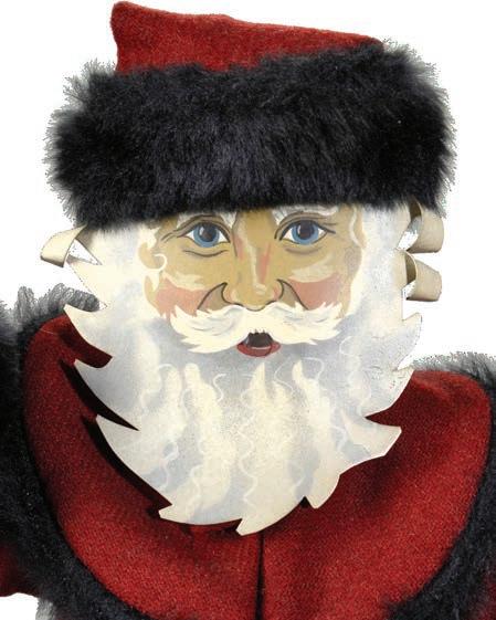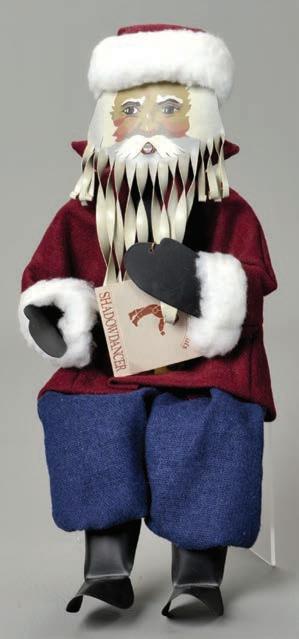 This larger 153⁄4-inch cut tin Santa is signed “Young/copyright 87.” He makes a commanding presence costumed in a winecolored wool coat with matching faux fur trimmed hat and blue wool trousers. What draws one’s attention to him is his dashing white-cut metal beard with curled metal. He carries an articulated tin toy. Santa is worn out after a long