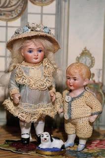 This 5.5” cutie is just the ticket! Inquisitive blue glass eyes, single-stroke brows, sweeping lashes, swivel neck, & double-strap blue shoes. Antique dress & gorgeous wig. Encircled by three porcelain Erphila Pups from Germany, they look adorable alone or at her side. Aren’t you ready for a Little Treat? Mignonette $1690. Pups $285